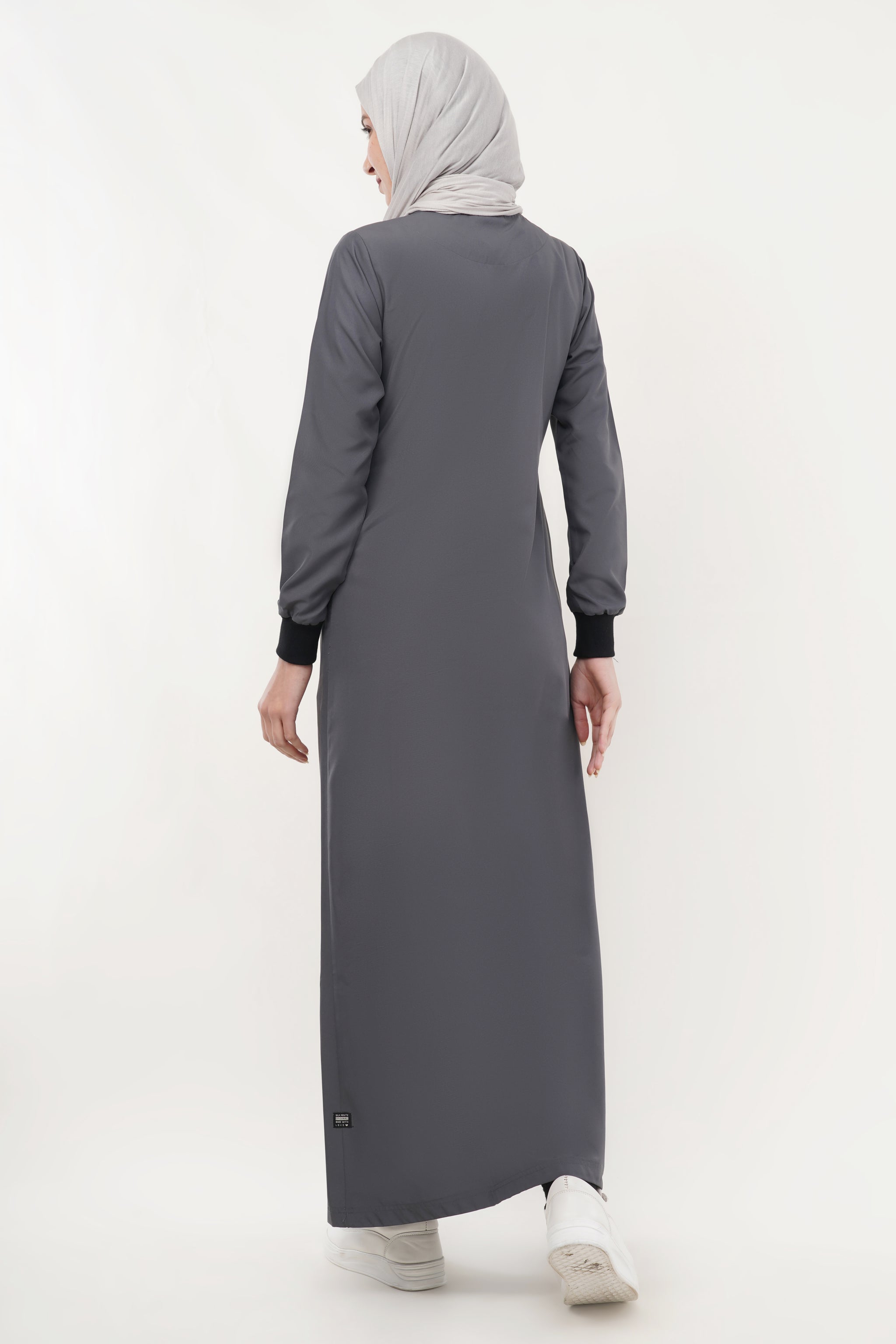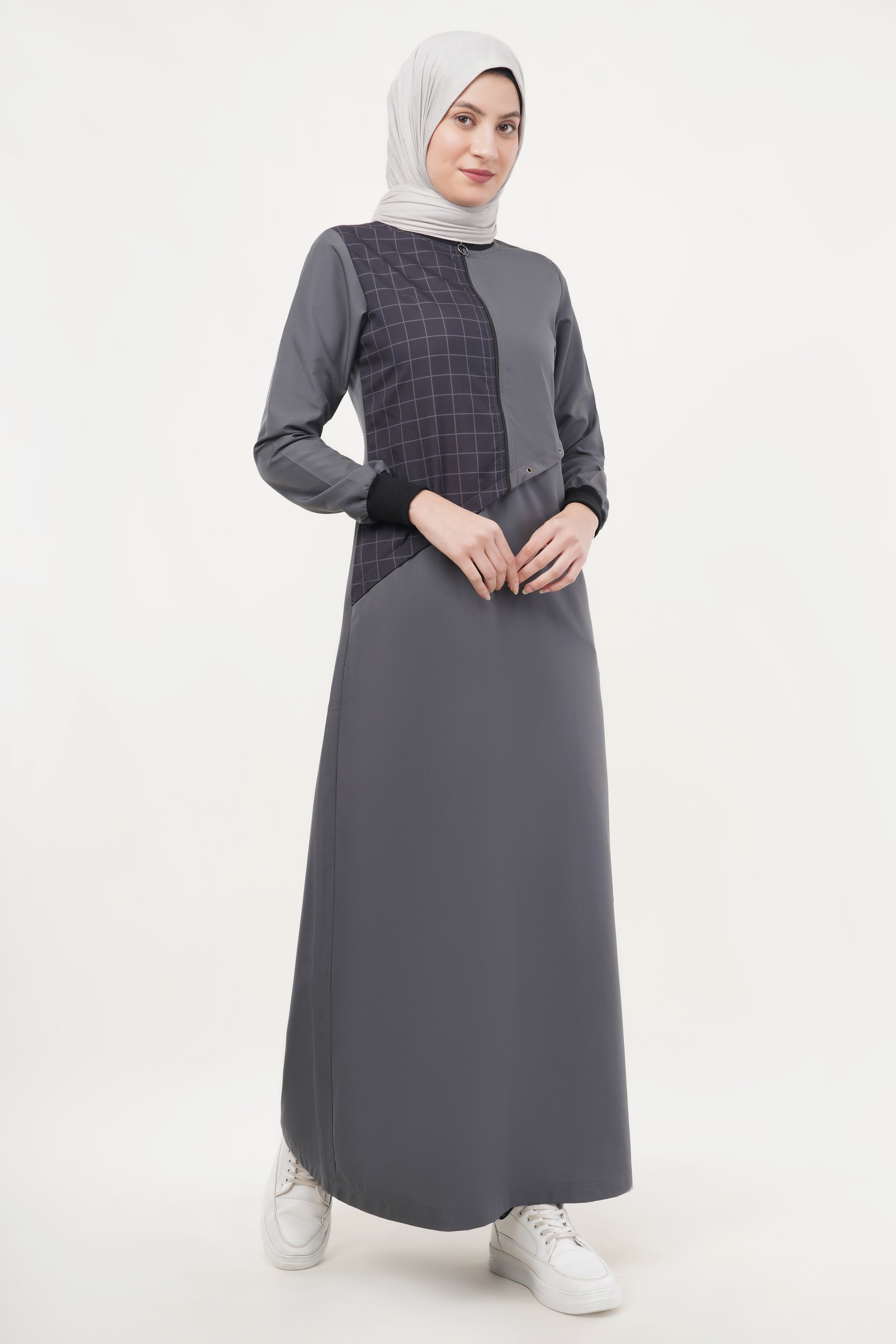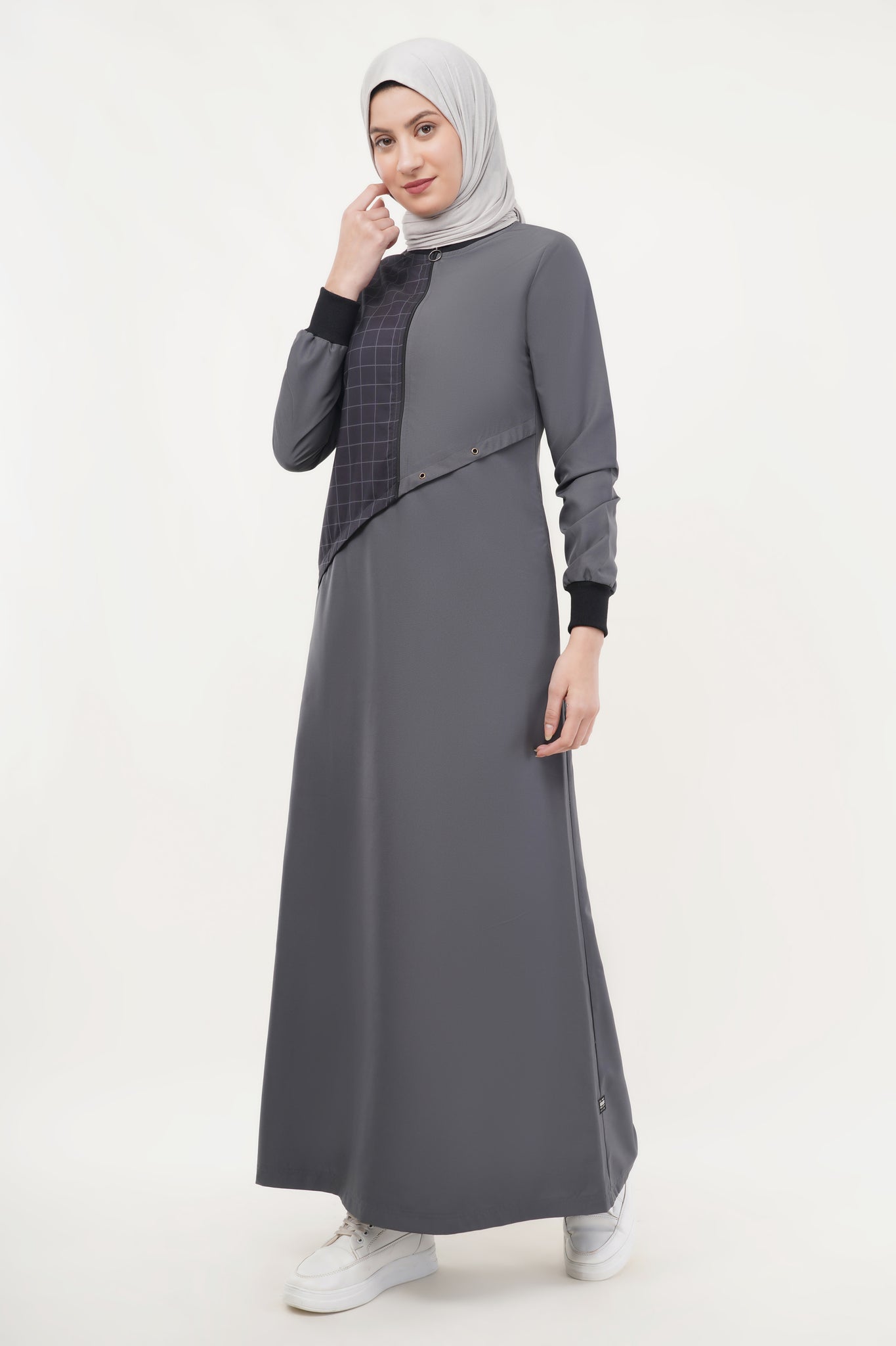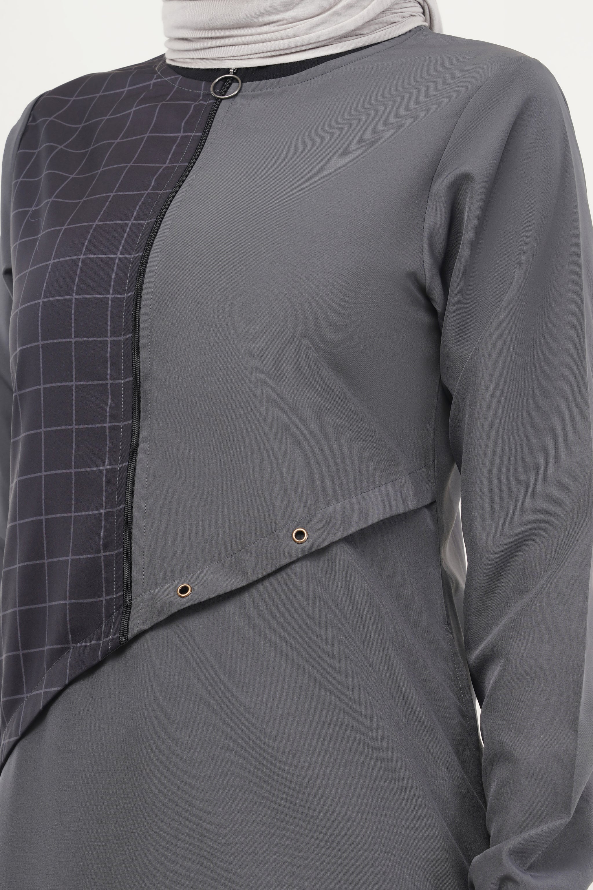 Defined by deep dark grey and black tones, this jilbab delivers a sleek, modern look suited for everyday wear. The subtle gingham accent adds quiet character while keeping the overall style minimal and refined. Designed for comfort and ease, its relaxed silhouette makes it a practical choice for work, travel, casual outings or even formal appearances. Style it with black or charcoal hijabs and understated accessories for a polished, contemporary modest outfit.