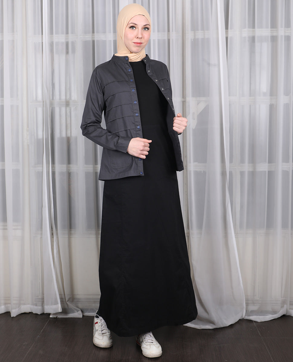 This jilbab features a modern mock jacket design with subtle pintuck details and metal branding on the chest. Made in teal blue and dark grey, it combines style with everyday practicality. The relaxed fit, soft fabric, and side pockets ensure comfort throughout the day. Perfect for casual outings, work, or travel, it can be styled effortlessly with neutral hijabs and minimal accessories.