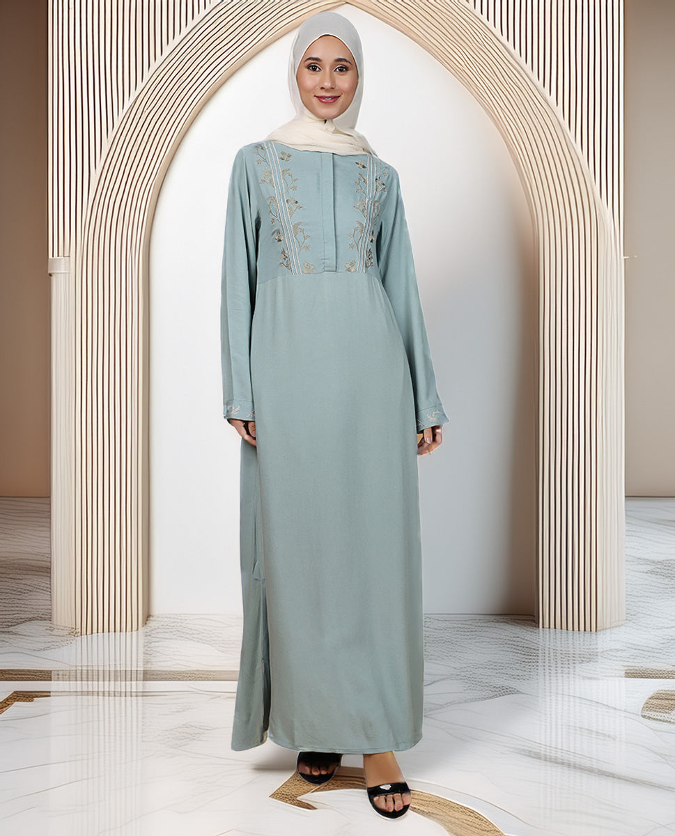 Gracefully crafted in soft, breathable viscose rayon, this Abaya blends tradition with modern charm. The bottle green hue offers a timeless appeal, while delicate multicolor embroidery adds a touch of personality and sophistication. With its flowing flared silhouette and subtle detailing, it's perfect for both everyday elegance and special occasions.