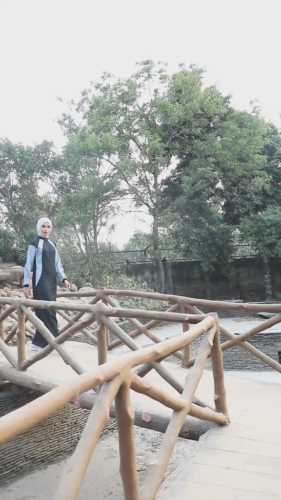 A modern twist on modest wear — this black and light blue jilbab features a raised collar, contrast chest panel, and sleek branding. Made from durable Taslon fabric with side pockets and ribbed cuffs, it's perfect for comfort and effortless style.