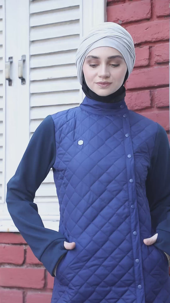 A contemporary modest layer blending texture and function. This jilbab features quilted body and contrast fleece sleeves that provide warmth, while dual side pockets and metal trim detailing add utility and style. Fully lined for effortless wear.