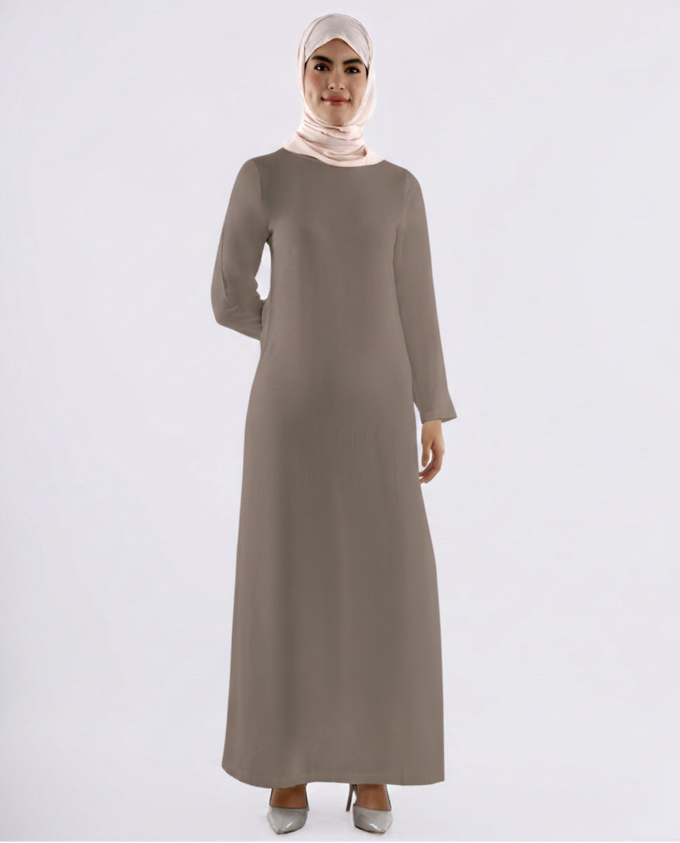 Full sleeves long slip dress to complement and complete your modest attire. Wear it as a dress/ pair it with an outerwear or use as an added layer with a dress to complete the look. Designed in a soft fabric and slim silhouette for a chic look and comfort. It's an absolute wardrobe essential. Long Full Sleeve Slip Dress Round neck detail Full Sleeve, Slim waist with regular Silhouette Curved hem at sides Slim Silhouette Main color - Grey Fabric - Viscose Rayon